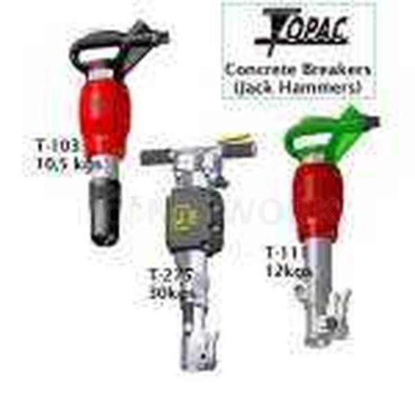 TOPAC T 111 = = - Weight = 12 kg - Ø piston mm = 37, 2 - Stroke = 110 mm - Impacts / min = 1.800 - Consuption L/ min = 1.100 - Chuck for Shank = Hex. 22 x 82, 5 - Air Hose = 19 mm ( 3/ 4" inch ) NB* * Air Compressor Kapasitas Min- 7 - 10 BAR * Efektif di gunakan pada bidang atau media Dinding dengan tingkat material kekerasan sedang.